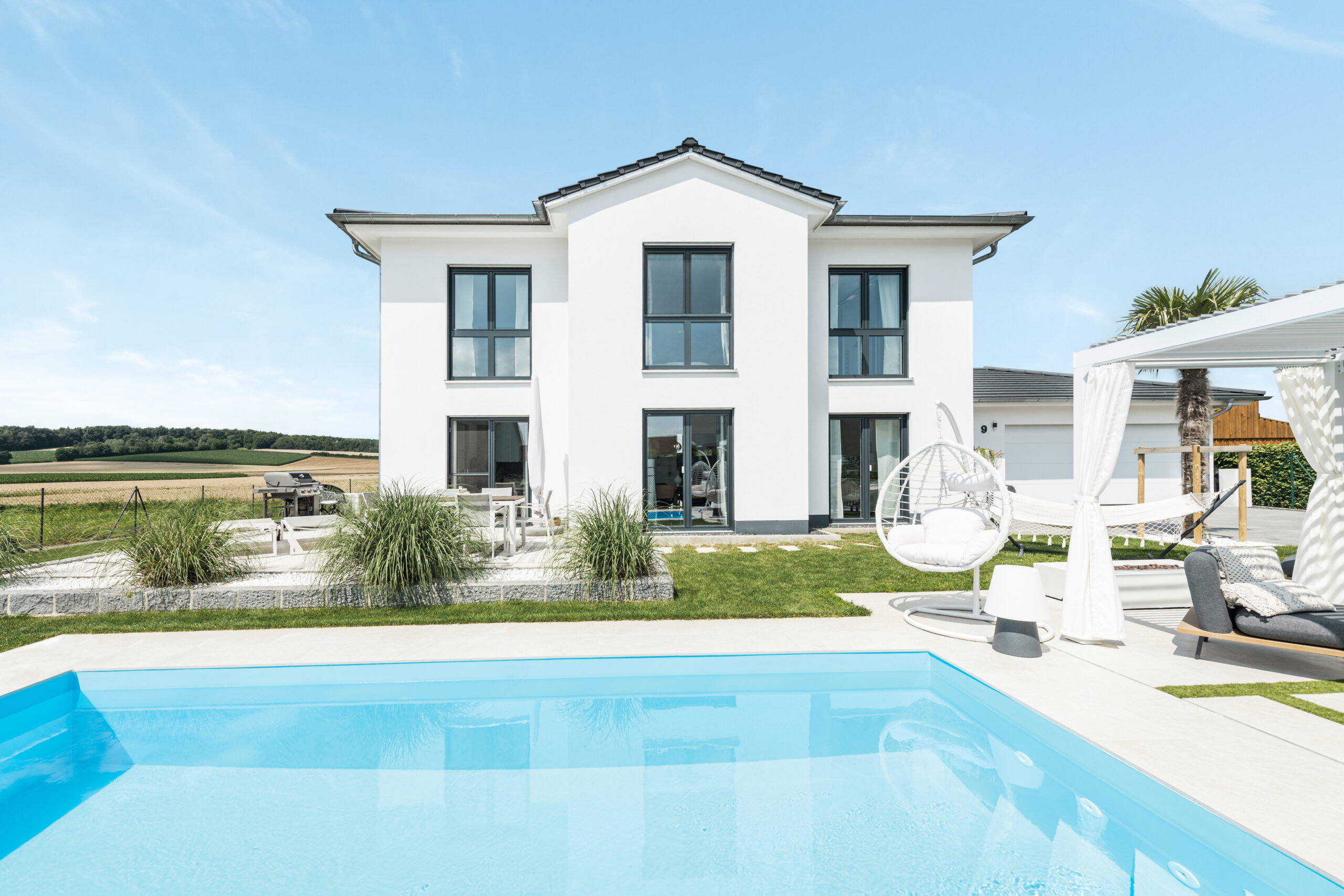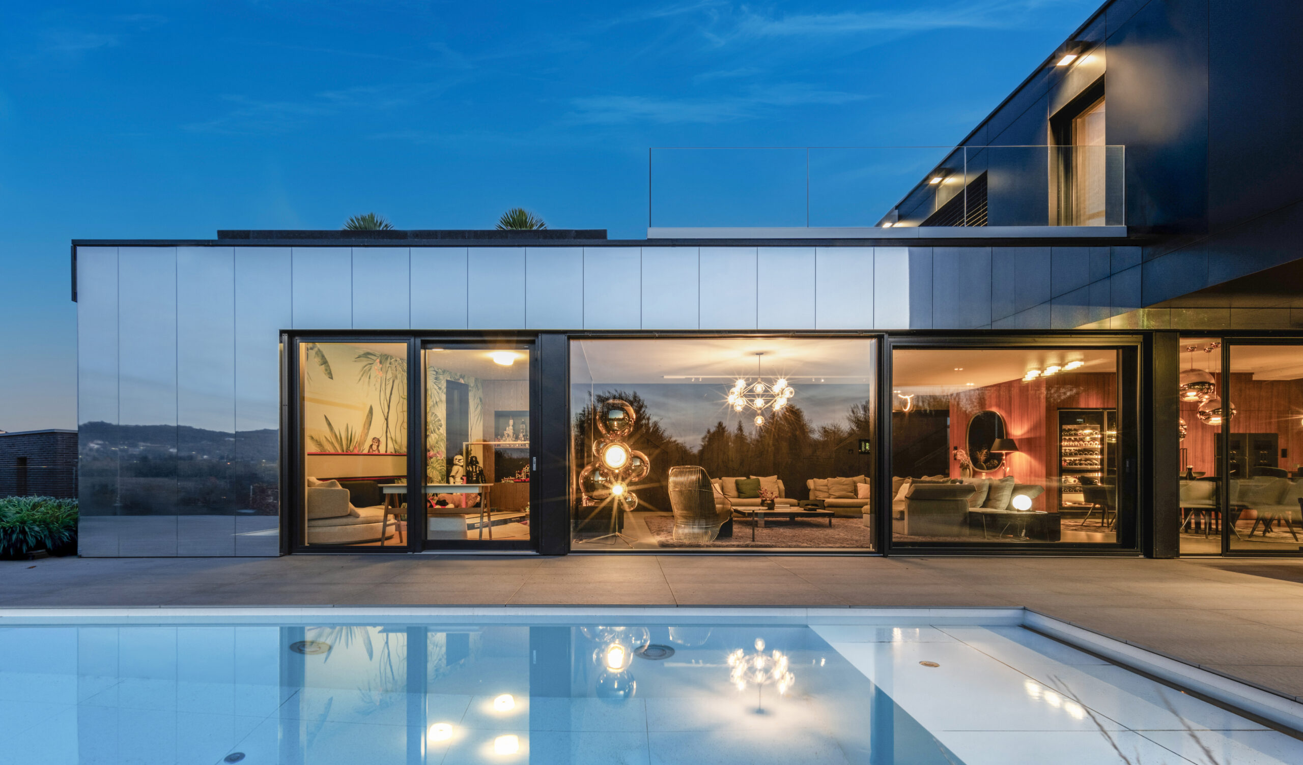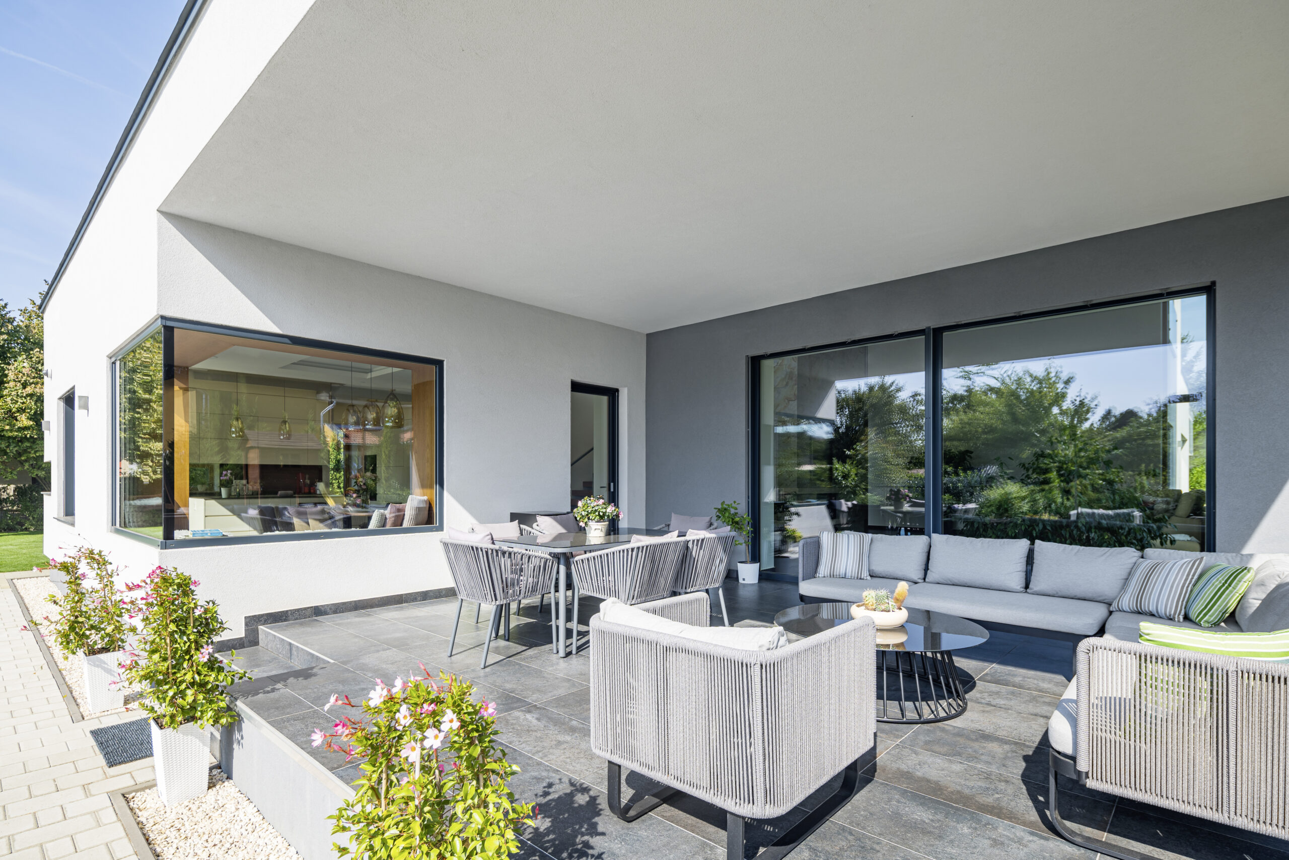 Styl je redukován jen na to nejnutnější: jasné tvary, čisté linie, úsporný design. Typická jsou plošně lícující velkoformátová okna a fixní zasklení, doplněné zdvižněposuvnými dveřmi.