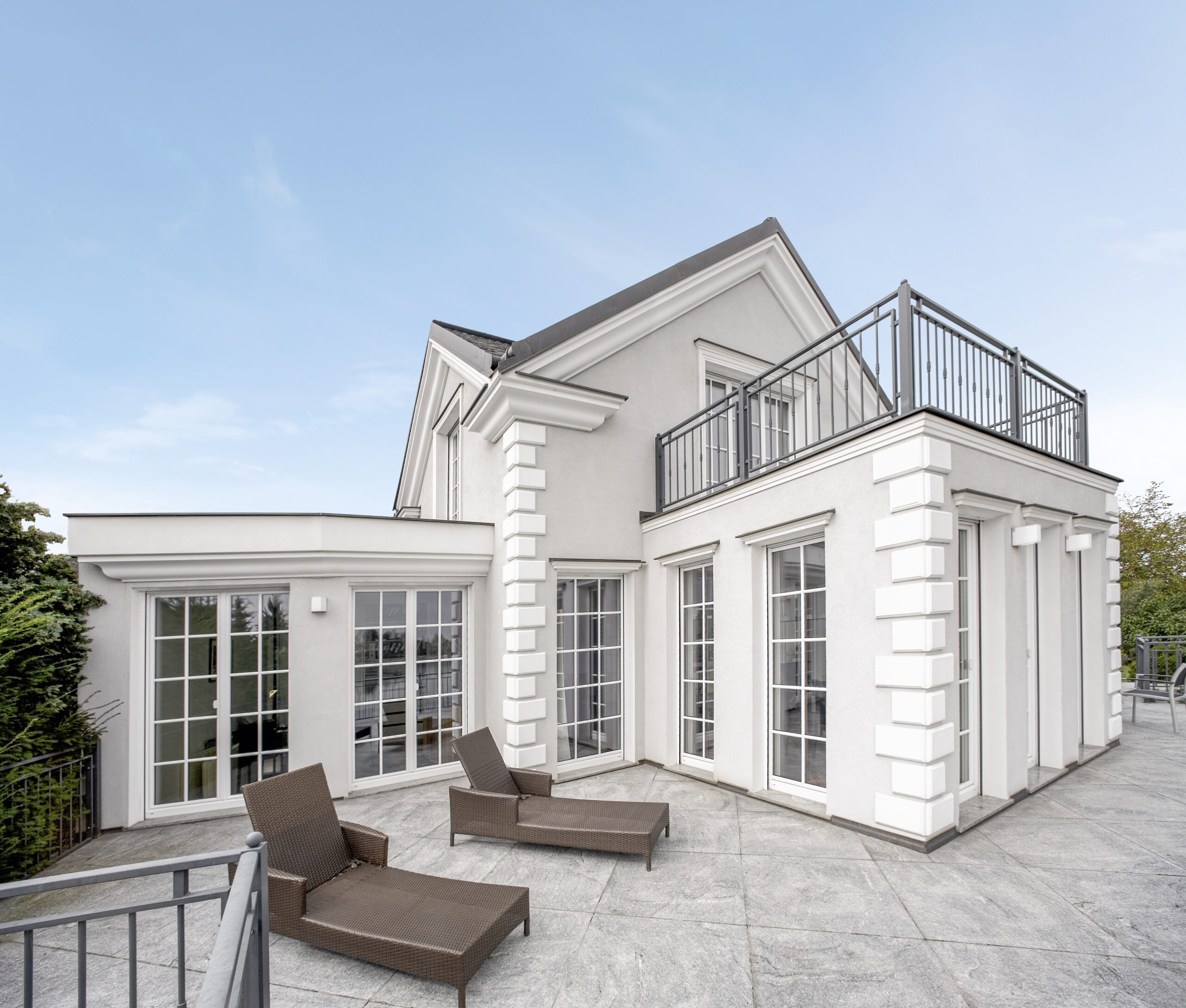 Klasika dokáže být nadčasová. Tradiční okna s mřížkami a vchodové dveře s ozdobnými lizénami z vašeho domova udělají elegantní venkovské sídlo.